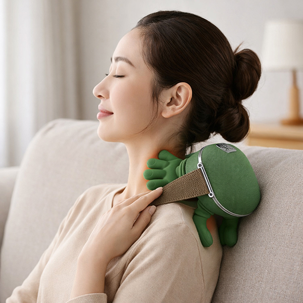 כרית עיסוי שיאצו חדשנית המדמה מגע של ידיים אמיתיות, מיועדת להרפיית אזור הצוואר, הכתפיים והגב.