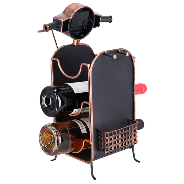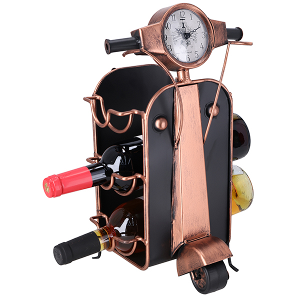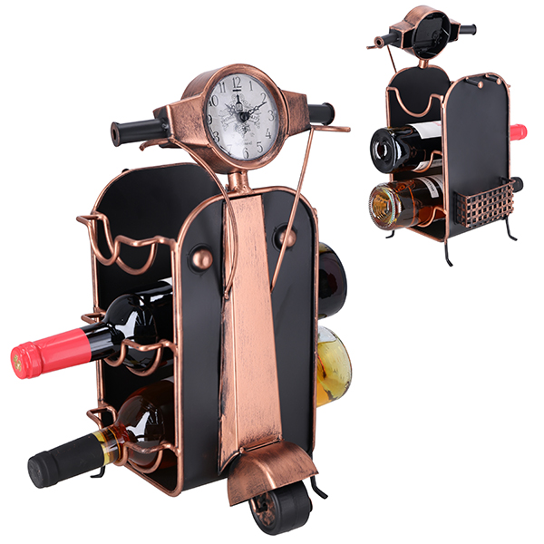מעמד יין ל-3 בקבוקים בצורת אופנוע עם שעון בגימור נחושת