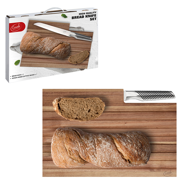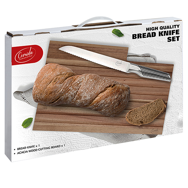 "Comida" סט לוח חיתוך לחם עץ איכותי ACACIA וסכין לחם נירוסטה 8.5" במארז מתנה